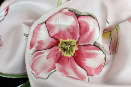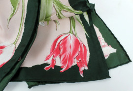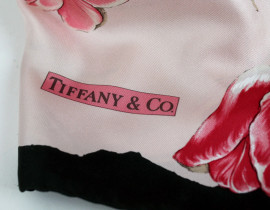 Tiffany & Co, foulard in seta, fantasia floreale su fondo rosa e bordi in verde scuro, cm 90x90