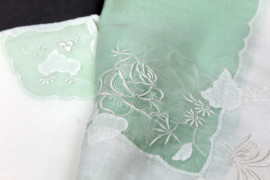 Tovaglia in organza bianca e verde ricamata, completa di 12 tovaglioli, cm 260x170, XX secolo
