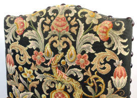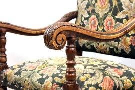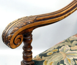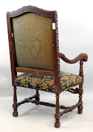 Trono in noce, schienale sagomato, braccioli a giorno desinenti a ricciolo, gambe tornite riunite da traversa, cm h 120