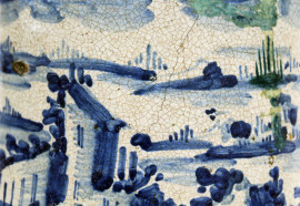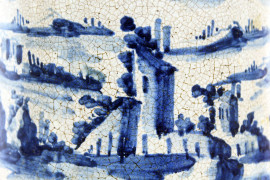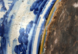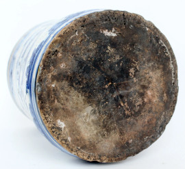 Vaso Savona del XVII-XVIII secolo in maiolica bianca e blu, decori raffiguranti paesaggio, profili in ocra, cm h 23,5, (difetti, filature, restauri)