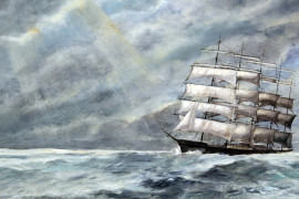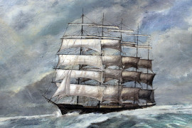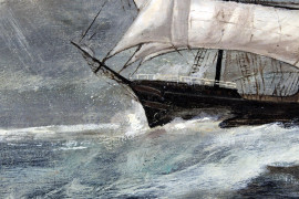 Veliero in navigazione, olio su tela, cm 52x74, XX secolo, entro cornice.
