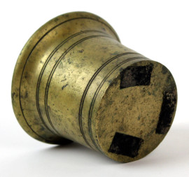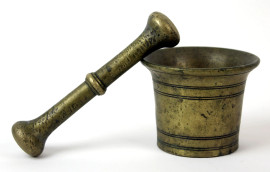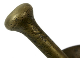 Antico mortaio e pestello in bronzo, alt. cm 15, (difetti).