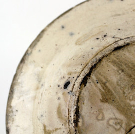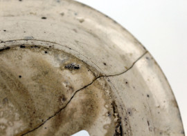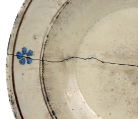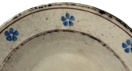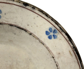 Antico piatto in ceramica Grottaglie, a smalto crema con decori in blu, diam. cm 22, (difetti e restauri)