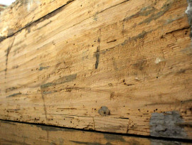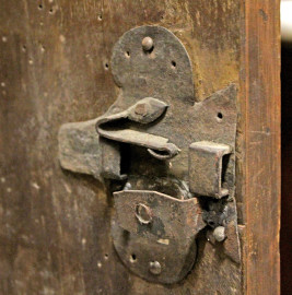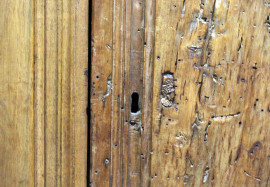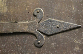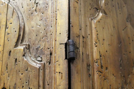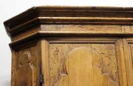 Armadio in noce del XVII secolo, cappello aggettante modanato, fronte a due ante pannellate, piede a mensola, cm 203x128x37, (segni del tempo).