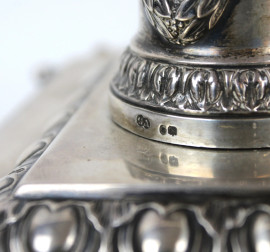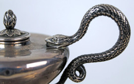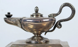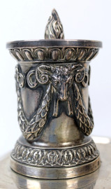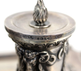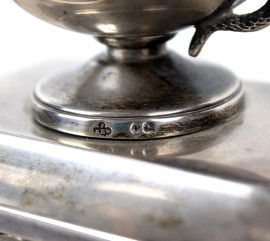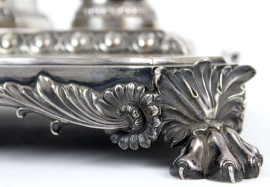 Calamaio in argento vittoriano, a due vaschette con decori di ghirlande e teste di ariete, base di linea rettangolare poggiante su quattro zampe ferine, cm h 21x26,5x37, gr. 2400