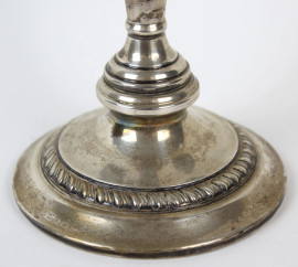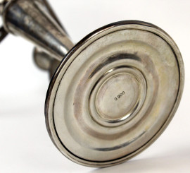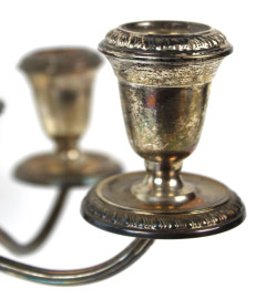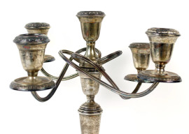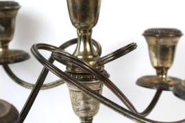 Candelabro in argento, a cinque fiamme con braccia sinuose, particolari cesellati, cm h 32,5, XX secolo.