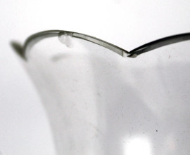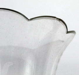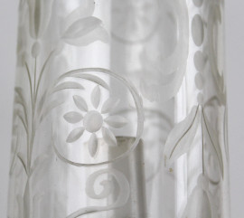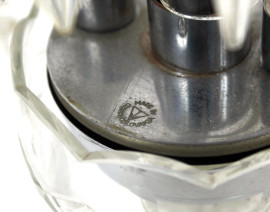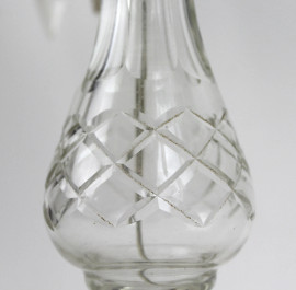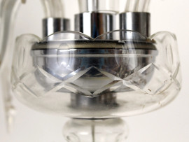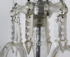 Candelabro in cristallo a tre braccia, con parafiamma decorati a motivi vegetali e a rocailles, fusto a balaustro poggiante su piede circolare, cm h 66, (piccoli difetti)
