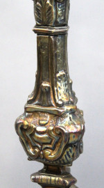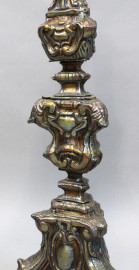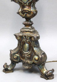 Candeliere in lamina sbalzata, trasformato a lampada, inizi XIX secolo, cm h 92,5, (segni del tempo)