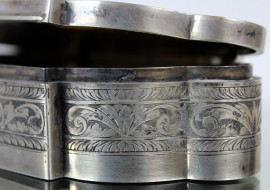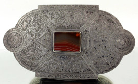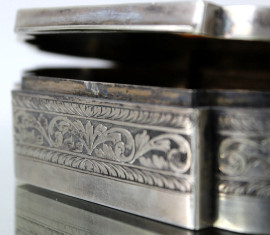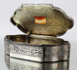 Cofanetto in argento, corpo interamente inciso a volute foglie e fiori, coperchio con castone in agata, cm 3,5x16x9, gr 314, (difetti)