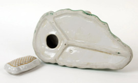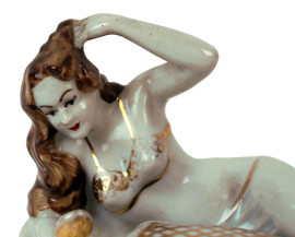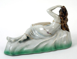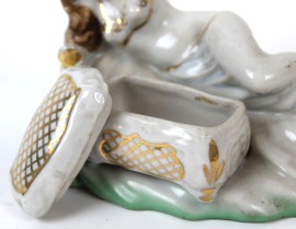 Cofanetto in porcellana policroma con modella distesa, cm 11,5, XX secolo, (difetti).