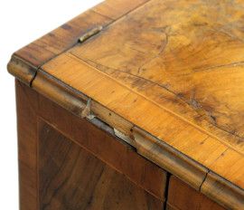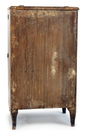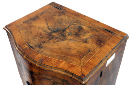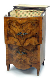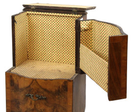 Comodino impiallacciato in legni pregiati, XIX secolo, fronte bombato ad uno sportello, piano a ribalta, cm 82x46x36, (difetti)