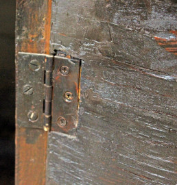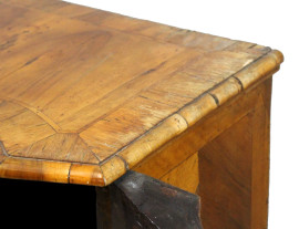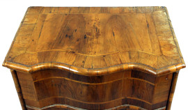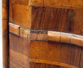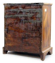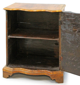 Comodino impiallacciato, XIX secolo, fronte bombato, ad uno sportello, piedi a mensola, cm 79x63,5x42, (difetti)