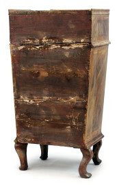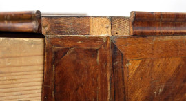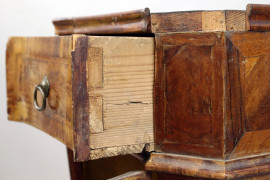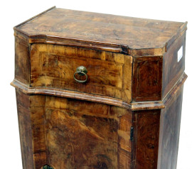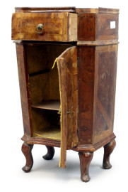 Comodino in noce, inizi XIX secolo, fronte ad un cassetto ed uno sportello, corpo troncopiramidale, gambe mosse, cm 77x42x31, (difetti)