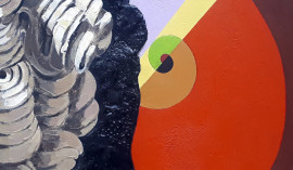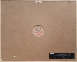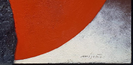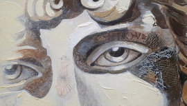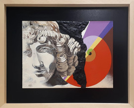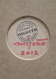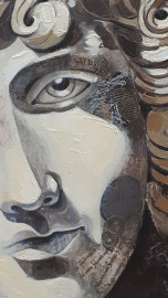 Composizione con figura classica, 2012, tecnica mista e catrame su legno, cm 32x42, firmato in basso a destra, reca al retro firma anno e timbro dell’Atelier dell’Artista, in cornice, con autentica. Esposizioni: Riflessi, mostra personale, Palazzo Ferrajoli Roma