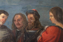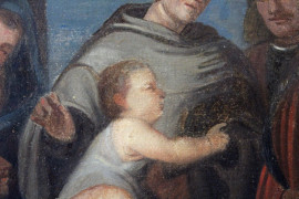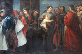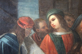 Copia da Tiziano Vecellio (Pieve di Cadore, 1488/1490 - Venezia, 27 agosto 1576), Miracolo del neonato, antico dipinto ad olio su tela, cm 39x58,5, entro cornice, (restauri)