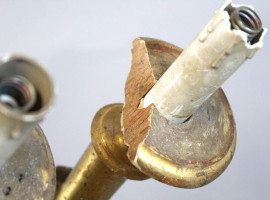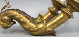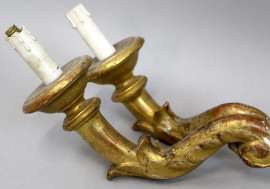 Coppia di appliques in legno intagliato e dorato a due luci, XIX secolo, cm 20x27x21 circa, (difetti)