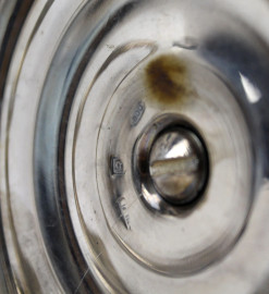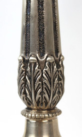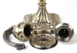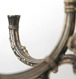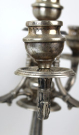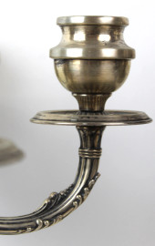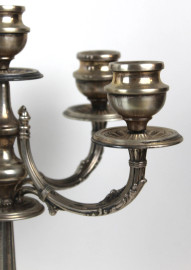 Coppia di candelabri in argento a cinque fiamme, braccia a volute fogliate, fusto a balaustro, poggiante su base sagomata, XX secolo, cm h 43,5, (appesantiti, difetti, parti rotte)