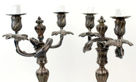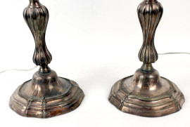 Coppia di candelabri in metallo argentato stile Luigi XV, a due fiamme con braccia a ramages, fusto torchon poggiante su base mistilinea, cm h 37,5, (difetti)