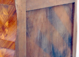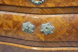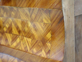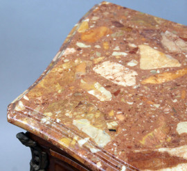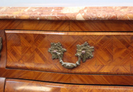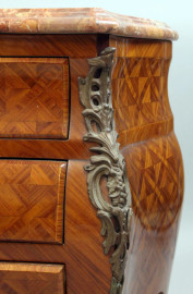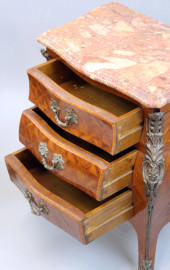 Coppia di comodini stile Luigi XV, lastronati in legni vari, piani in marmo, fronte bombato a tre cassetti, piedi a sciabola, finiture in bronzo, cm 65,5x33,5x51, (piccole mancanze alla ferramenta)