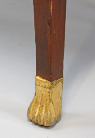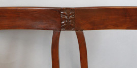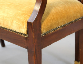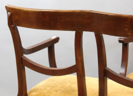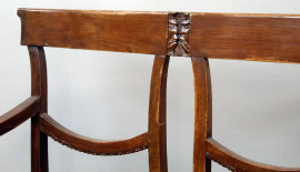 Coppia di divanetti in noce, XX secolo, doppio schienale a giorno, seduta imbottita e rivestita in stoffa gialla, gambe troncopiramidali desinenti a zampa ferina, cm 84x46x81, (segni del tempo).