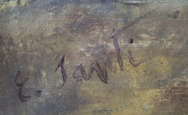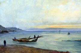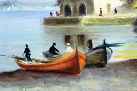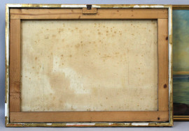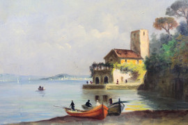 Coppia di paesaggi costieri con figure, olio su tela, cm 50x70, entro cornici