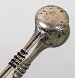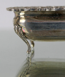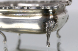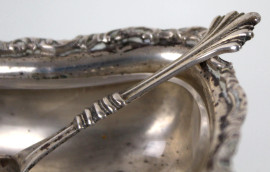 Coppia di salierine in argento con cucchiaini, corpo sagomato poggiante su piedi mossi, alt. cm 3, XX secolo, gr. 65