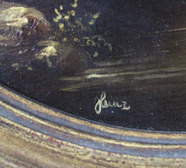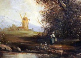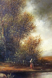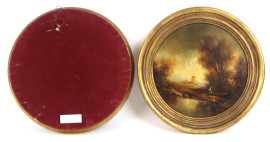 Coppia di tondi raffiguranti scorci di campagna, olio su rame, diametro cm 16,5, XX secolo, entro cornici.