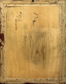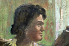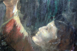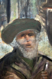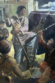 Donna con soldati rivoluzionari, olio su compensato, cm 114x88, entro cornice, (difetti).