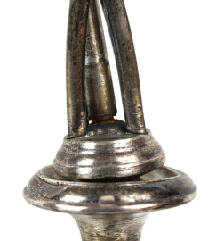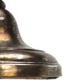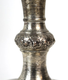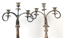 Due candelabri Liberty in metallo argentato a tre fiamme, fusti non pertinenti, cm h 52x30x13,5, (difetti, parte rotta)