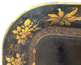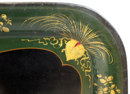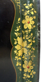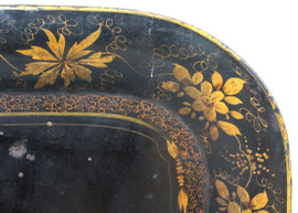 Due grandi vassoi di linea rettangolare in metallo laccato, decori floreali dorati, cm 54,5x76, inizi XX secolo, (difetti).