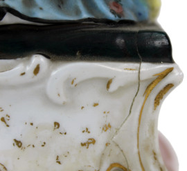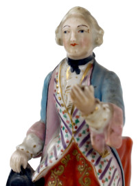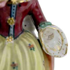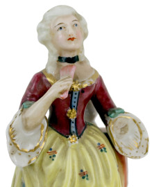 Gentiluomo e gentildonna, coppia di figure in porcellana dipinta in policromia, finiture dorate, XIX secolo, cm h 21, (restauri, mancanze)