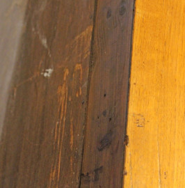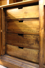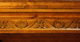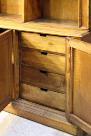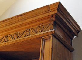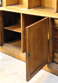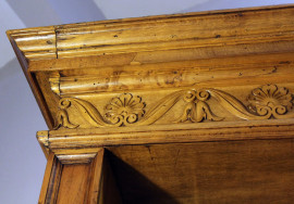 Grande libreria in noce a doppio corpo, XX secolo, cappello modanato e fregio scolpito a palmette e volute, parte superiore a tre vani mensolati,parte inferiore a tre sportelli di cui uno celante quattro cassetti, cm 263x196x47, (difetti e segni del tempo).