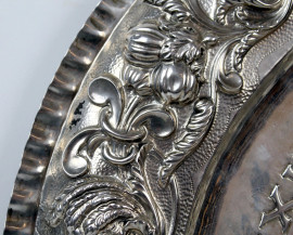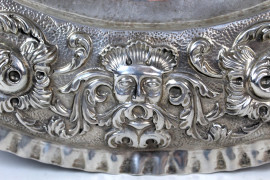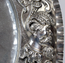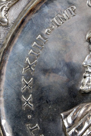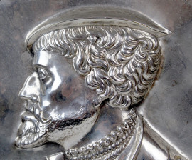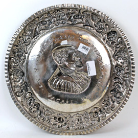 Grande piatto in argento, Germania, XIX secolo, raffigurante ritratto dell'imperatore Carlo V, decori a sbalzo, diam. cm 51,5, gr. 1580