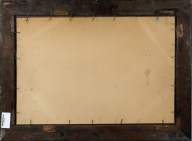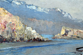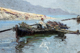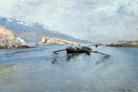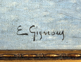 Lago con imbarcazioni, olio su cartone telato, firmato E.Gignous, cm 39x58, entro cornice.