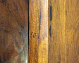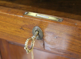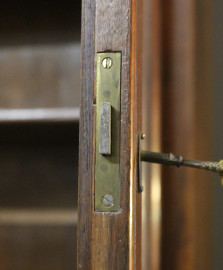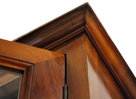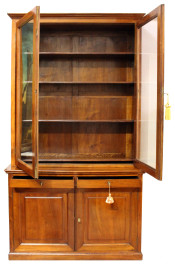 Libreria in noce, corpo superiore a due sportelli a vetri, corpo inferiore a due cassetti e due sportelli, manifattura per il Ministero dell'Istruzione, Firenze, 1870, cm h 246x137x49