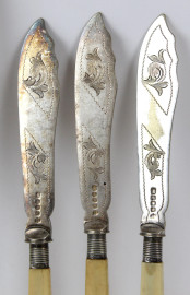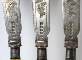 Lotto composto da 6 forchettine, 6 coltellini e 2 posate da dolce in Sheffield, inizi XX secolo.