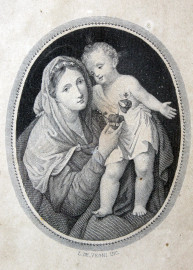 Lotto composto da due stampe raffiguranti la Vergine con Bambino e La Tour du Grande Horologe à Berne, ed un disegno a carboncino raffigurante ritratto di nobildonna, misure max cm 17,5x12,5, XIX secolo, entro cornici.