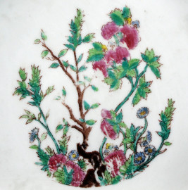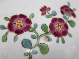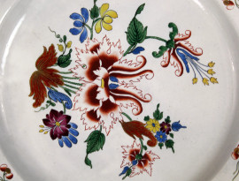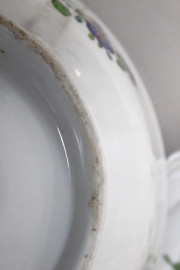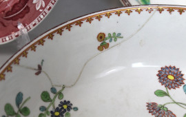 Lotto composto da quattro piatti piani, una coppa grande ed un piatto da portata in porcellana policroma, manifatture ed epoche diverse, diam. max cm 34, (difetti e restauri).