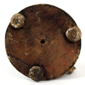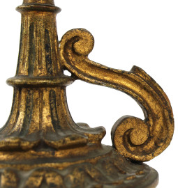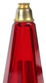 Lotto composto da una bottiglia portaprofumo in cristallo rosso rubino sfaccettato, un portacoppa in metallo dorato ed un portacandela in legno intagliato e dorato, alt. max cm 22, manifatture ed epoche diverse, (difetti).