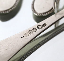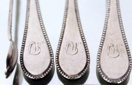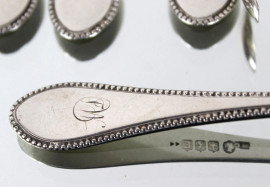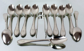 Lotto composto da undici cucchiaini da thè e una pinza per zucchero in argento, entro custodia, gr. 270