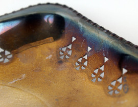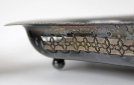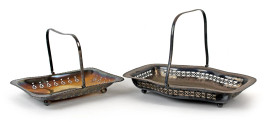 Lotto di due cestini in metallo argentato, dettagli traforati, misure max 21,5x28,5x5.