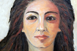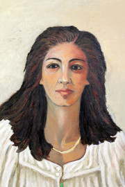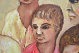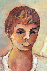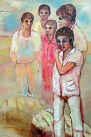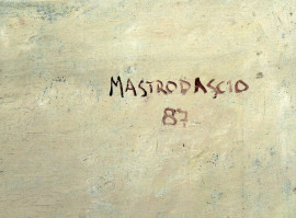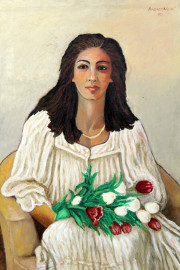 Lotto di due dipinti raffiguranti donna seduta con tulipani e gruppo di giovani, olio su tela, cm 101x70, firmati Mastrodascio