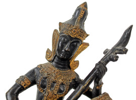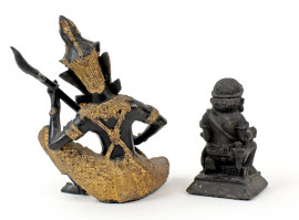 Lotto di due piccole sculture in bronzo e terracotta raffiguranti Suonatore Siddharta e Guardiano Gupolo, alt. max cm 14,5, XX secolo, (difetti).