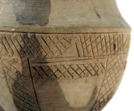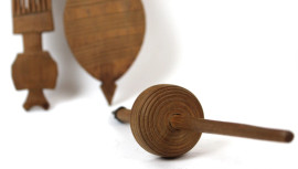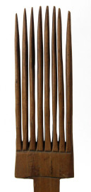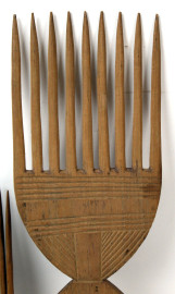 Lotto di quattro oggetti in legno, composto da: un contenitore, due pettini e un fuso per filare, altezza max cm 21, arte africana, XX secolo, (difetti).