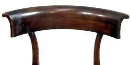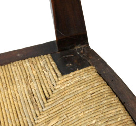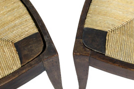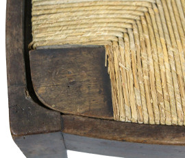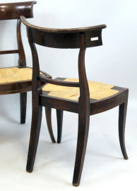 Lotto di tre sedie in noce, seduta in paglia, gambe a sciabola, XIX secolo.