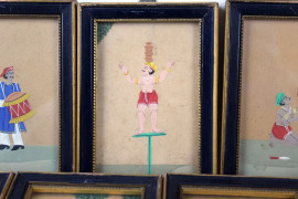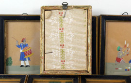 Lotto di tredici miniature raffiguranti personaggi indiani, acrilico su pellicola acetata, cm 9,5x6,5, XX secolo, entro cornici.