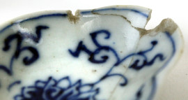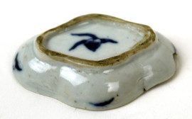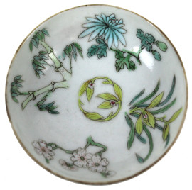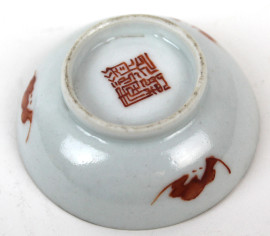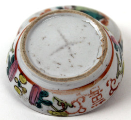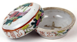 Lotto di una scatola e due piccole coppette in porcellana policroma, Cina, XX secolo, cm h 4, diam. cm 8, (difetti).