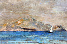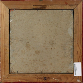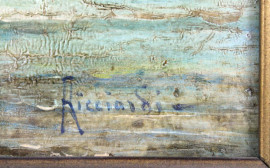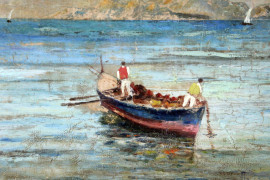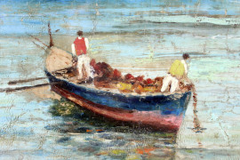 Mare con imbarcazioni e figure, olio su cartone, cm 26x26, firmato, entro cornice.