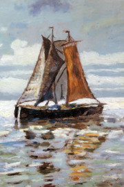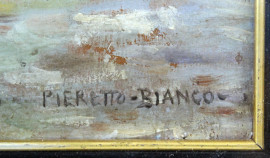 Marina con barca, olio su cartone, cm 36x25, firmato, entro cornice