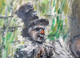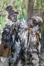 Maschere, olio su compensato, cm 26x14, firmato, entro cornice.